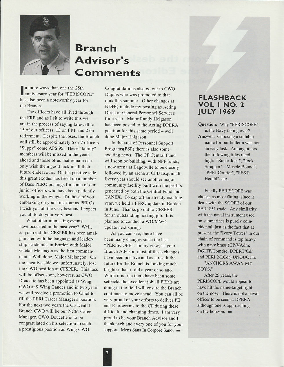 Historical detail and photographs contained herein have been accumulated over many years and were obtained from a number of sources; the vast majority having been received from former Physical Education Branch personnel. It is not our intention to violate anyone's copyright by posting these pictures or articles. If you find something here that treads on your copyright or which has not been properly credited, let us know and we will immediately remove such material until proper permissions have been obtained. All of the articles, interviews, pictures and content are the property of the Periscope web site. Users may view and download material only for personal, non-commercial home use. We do not have the authority to approve the reuse of any material found on this web site. You will need to obtain written permission from the source to reproduce, republish, upload, post, transmit, distribute or publicly display material from this web site.  As it is not unusual for people to change their address and forget to advise us of the change, we cannot guarantee that existing phone numbers and addresses (both home and e-mail) are current. Thank you for your interest and we hope you enjoy browsing through our web site.